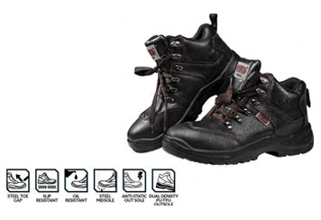 Steel toe cap, slip resistant, oil resistant, steel midsole, anti-static out sole, dual density PU/TPU outsole.